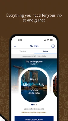 Mở ra thế giới du lịch tinh tế với SingaporeAir, người bạn đồng hành không thể thiếu của mọi hành trình. Được thiết kế với sự tỉ mỉ, SingaporeAir mang đến trải nghiệm liền mạch, trực quan và cá nhân hóa, biến mỗi chuyến đi từ khâu lập kế hoạch đến tận khi hạ cánh thành một niềm vui đích thực. Chúng tôi liên tục phát triển và bổ sung tính năng mới, đảm bảo bạn luôn có những công cụ tốt nhất để khám phá thế giới.